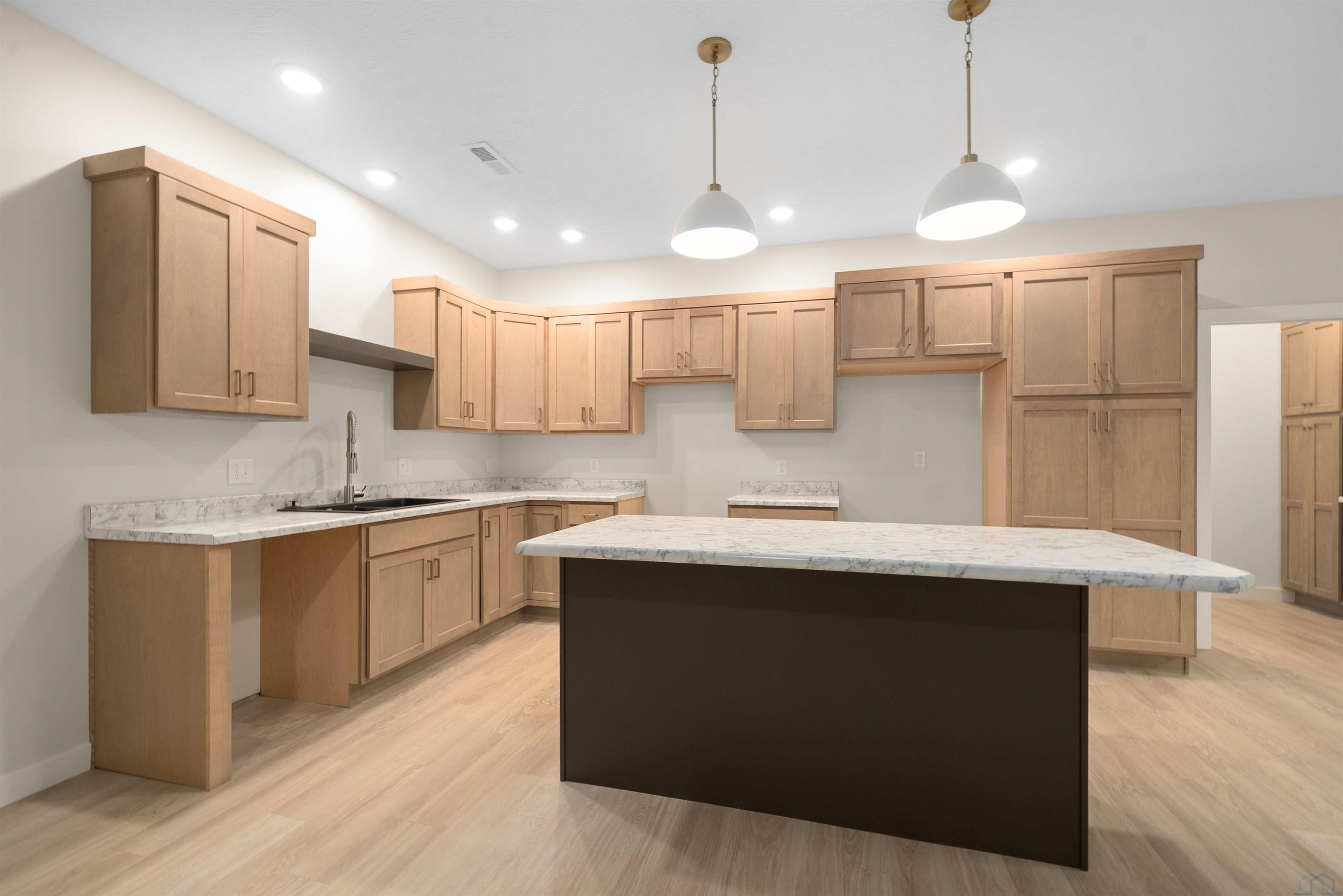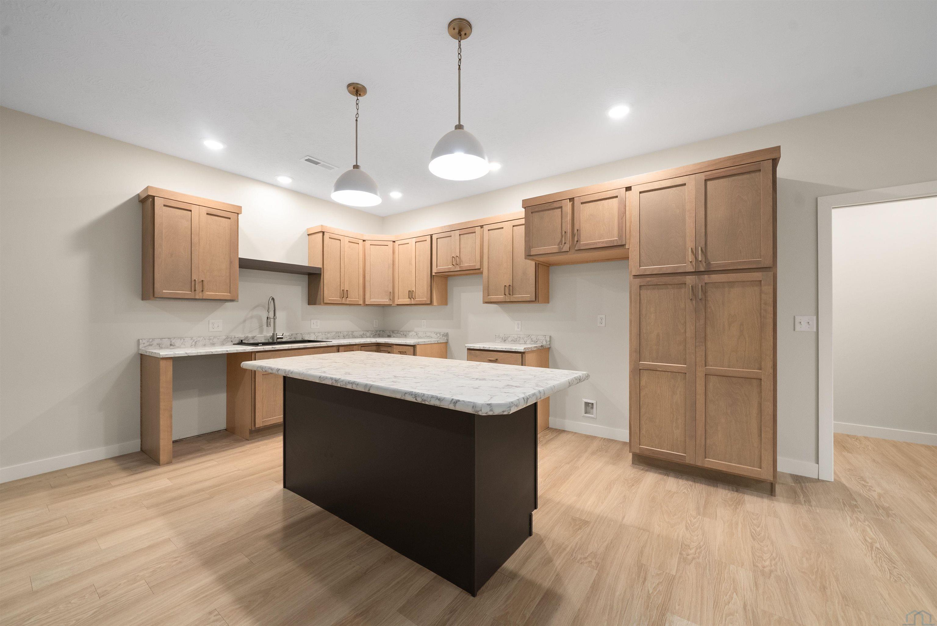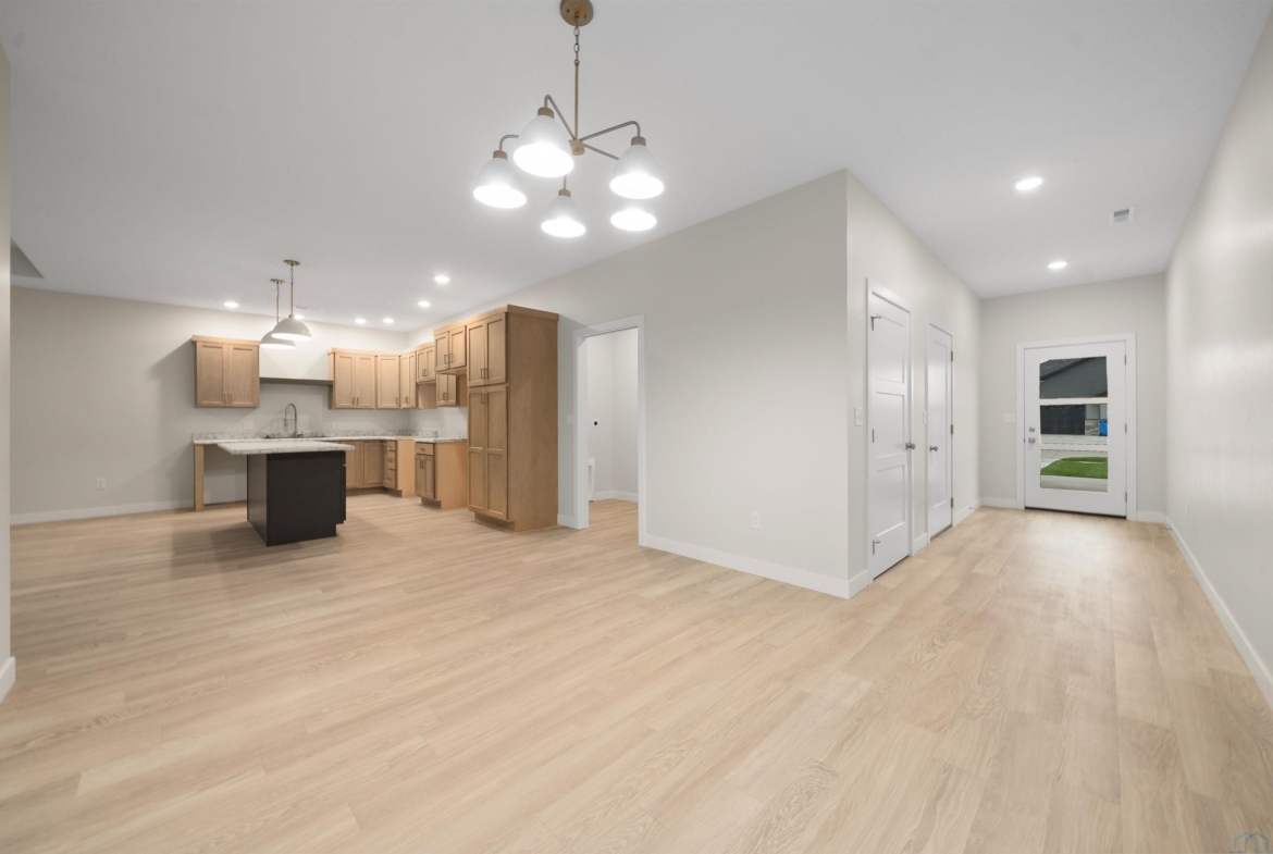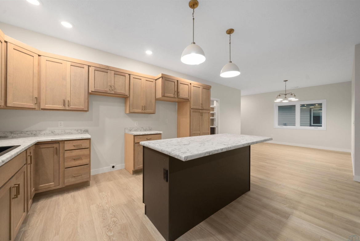 Step into style and comfort with this stunning, brand-new construction twin home, featuring a convenient slab-on-grade design. This home is thoughtfully designed for modern living with an open-concept layout that seamlessly connects the kitchen, dining, and living areas. The kitchen is a chef’s delight, offering abundant cabinetry, a spacious island, and a large pantry cabinet with pull-out drawers—perfect for both everyday meals and entertaining. Throughout the home, you’ll appreciate stylish touches like three-panel doors and a 10-foot tray ceiling in the living room. The main floor laundry room is conveniently located with a pocket door and provides extra storage with additional cabinets and counter space. Your primary suite is a true retreat, boasting a luxurious walk-in onyx shower, double vanities with ample counter space, and a pocket door leading to a spacious walk-in closet. Across the hall, you’ll find two additional bedrooms, both with double closets, and a full bath complete with a linen cabinet. The finished two-stall garage features a modern garage door and a service door for easy access. Outside, enjoy a tasteful patio and a fully landscaped yard with sod and a sprinkler system. This home also includes high-efficiency windows and is prepped for in-floor heating. Located in the beautiful Bliss Pointe development, this quality-built home by AMS Building Systems is a must-see! Interior photos and video are of 1220 side only. Both 1220 and 1222 Zitkala-sa currently available.